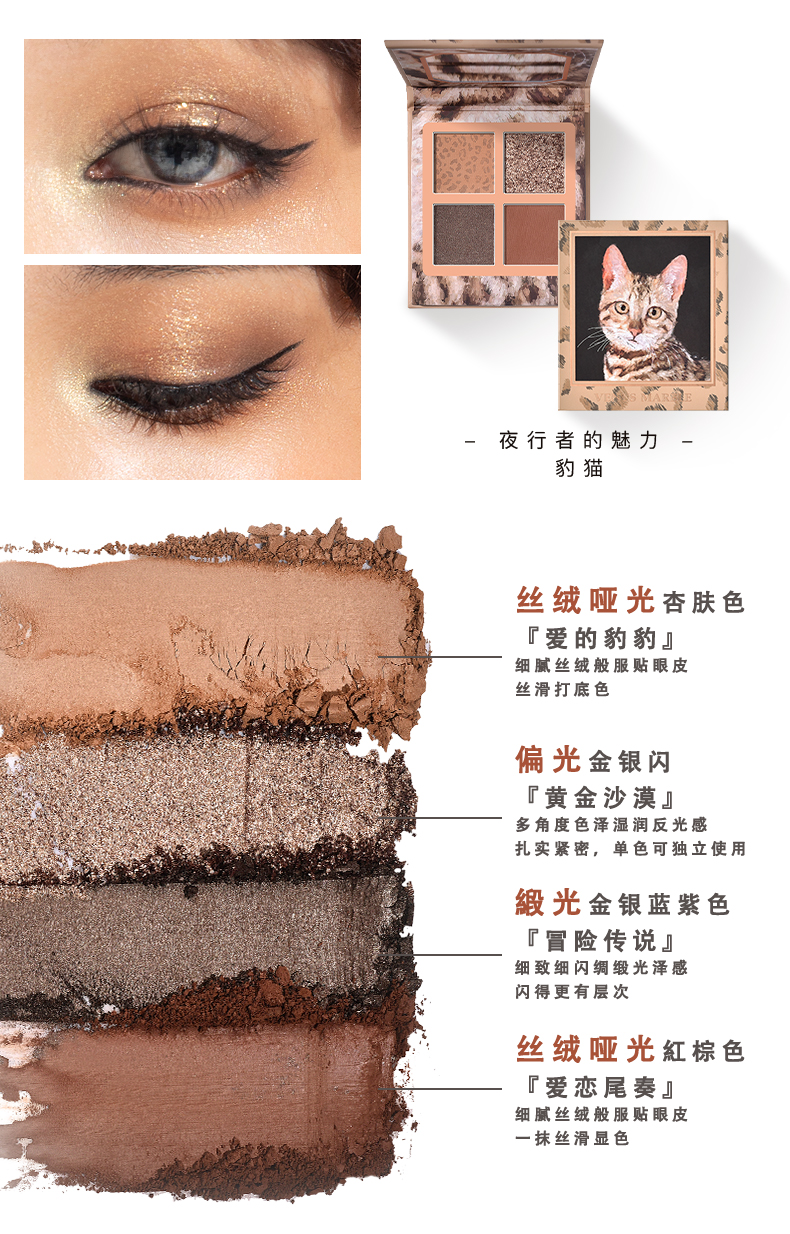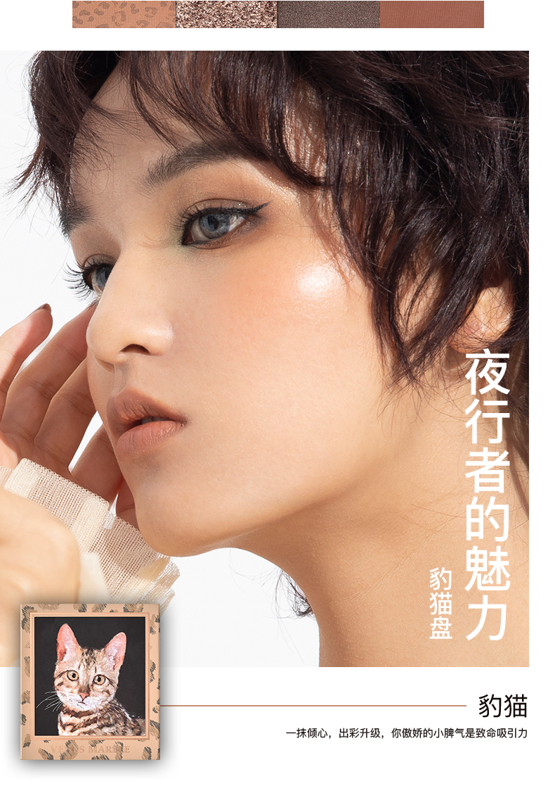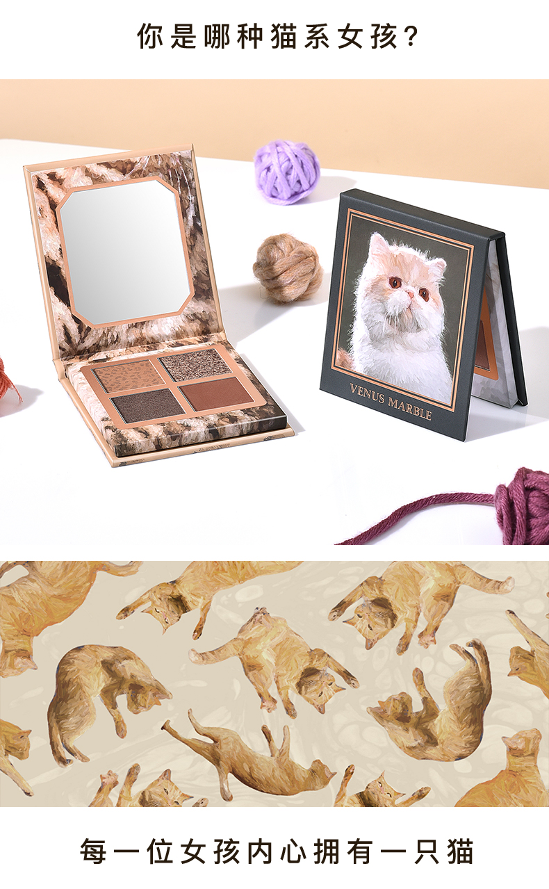 Packaged with a cute cat painting, the highly colored eyeshadow and lustrous glitter create a beautiful and captivating look.